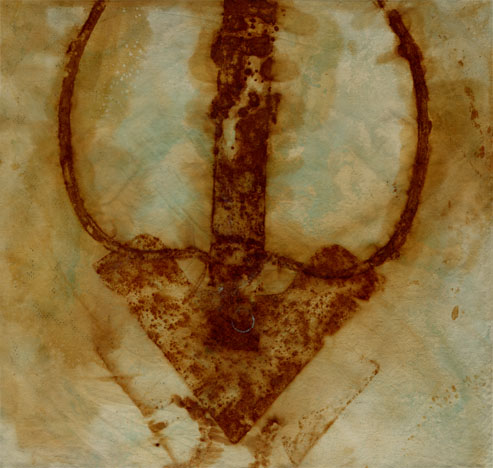 The heart chakra is the seat of balance for preservation, creation and destruction. Opening your heart can release the flow that has been building up and will lighten the load and pressure we carry around with us. This piece was made with my rusting process but I used a tannin